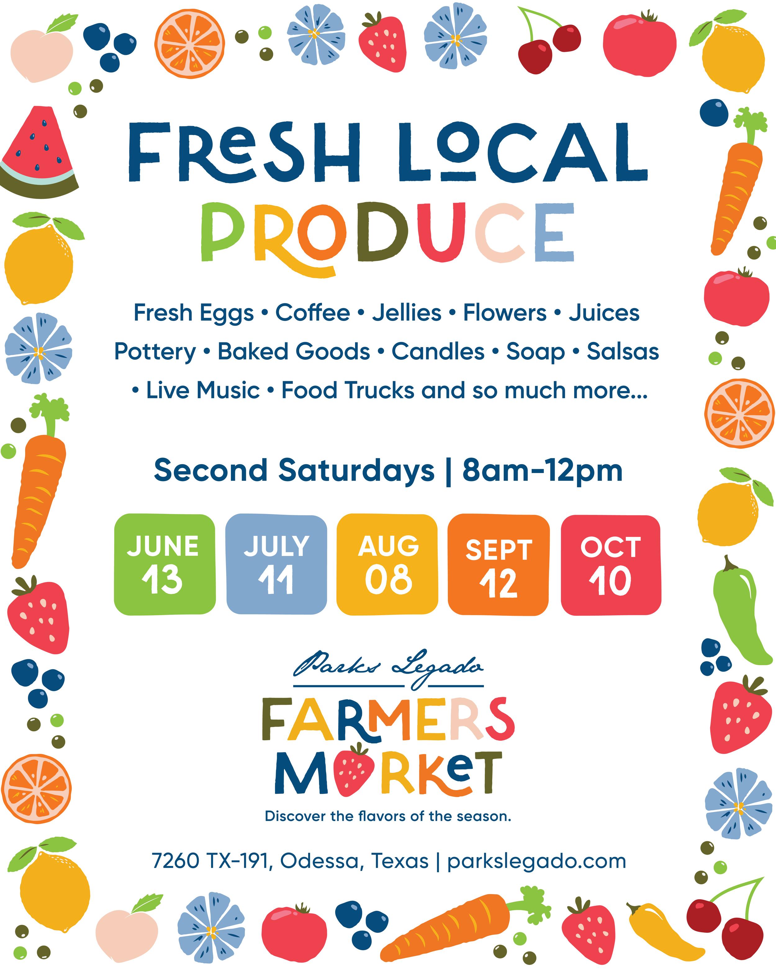 Since 2017, The Parks Legado Farmers Market has worked to provide interaction between West Texas farmers, bakers, artisans, and consumers. Our mission is to promote local production of agricultural and specialty products while also enhancing the quality of life in our area by providing a community activity that promotes a wholesome, social gathering place.